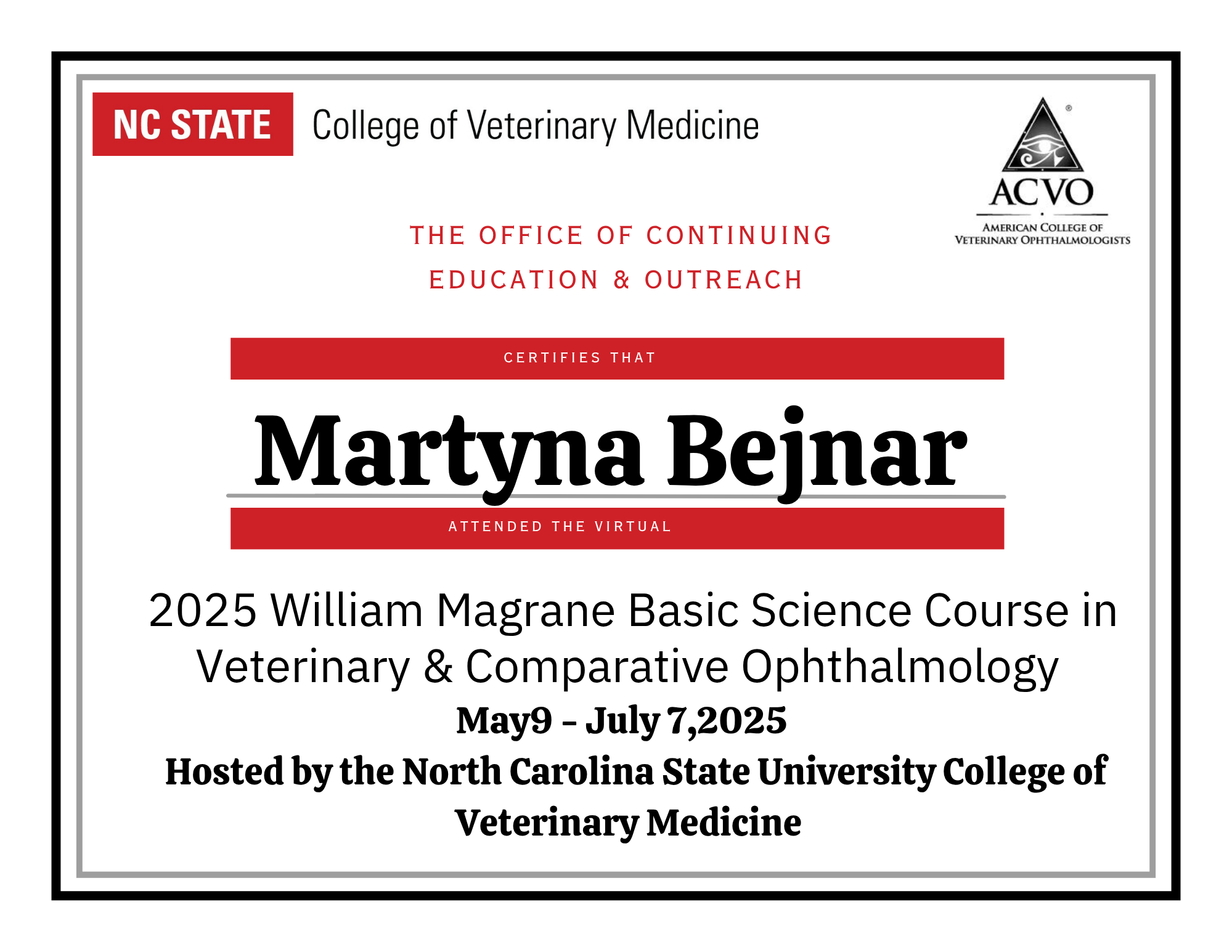 Jestem aktywną członkinią Wschodnioeuropejskiego Stowarzyszenia Okulistyki Weterynaryjnej (EESVO), co pozwala mi być na bieżąco z najnowszymi osiągnięciami i badaniami w dziedzinie okulistyki weterynaryjnej.